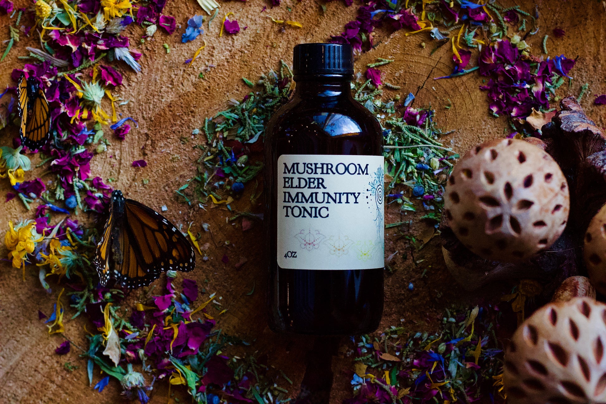 Organic and Wild Harvested Ingredients: Double Extracted *Fresh/Frozen* Elderberries, Maine Wild-harvested Chaga & Reishi, Cinnamon, Clove, Cardamom, Ginger, Raw Honey, Raw Apple Cider Vinegar, Brandy, Propolis Extract.